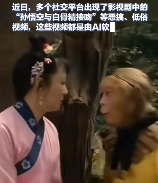 此前,“AI接吻”技術也曾在社交平臺引發爭議。不少網友發出的視頻中,出現了唐僧和女兒國國王、孫悟空和白骨精等人物擁抱接吻的惡搞低俗視頻。