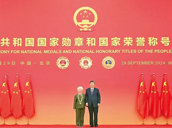 2024年9月29日,中華人民共和國國家勛章和國家榮譽稱號頒授儀式在北京人民大會堂金色大廳隆重舉行。中共中央總書記、國家主席、中央軍委主席習近平向“人民藝術家”國家榮譽稱號獲得者田華頒授獎章。 新華社記者 謝環馳/攝