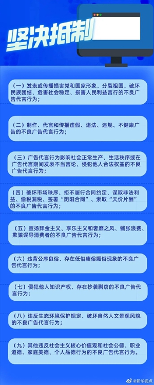 《自律公約》對九項不良廣告代言行為提出堅決抵制 新華社制圖