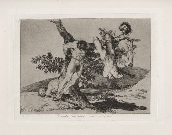 戰場上的死亡場景,被槍殺的堆積如山的尸體,戰爭所導致的饑荒……構成殘酷戰爭的系列畫面。戈雅在美與丑之間,描繪了一個被戰爭所摧毀的國家。“戰爭的災難”系列作品從“為即將發生之事而悲哀”這一幅作品開始,這幅畫作中,一個男子被暗色的背景所包圍,張開雙臂,雙眼無助地望著上天。戈雅通過對夜色的隱喻,暗色調的使用,來表現絕望與世間的混亂。明知自己所處的苦難而又無法避開,這是一種莫大的痛苦。他通過畫面暗示出基督形象,站在高處俯看各個歷史事件和一場場戰爭災難,表達了對戰爭充滿恐怖,無助與絕望。這一組作品直至1828年作者去世后35年才得以出版。