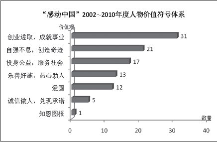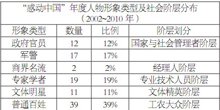 上表是筆者將2002~2010年度“感動中國”人物形象(含群體,共100名)按照形象身份和所屬社會階層做的類型化處理,并最終生成為7類價值符號(見圖)。