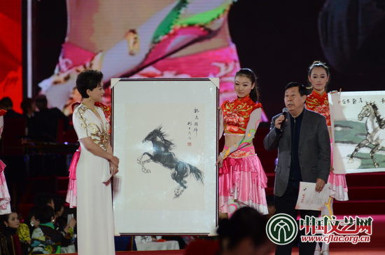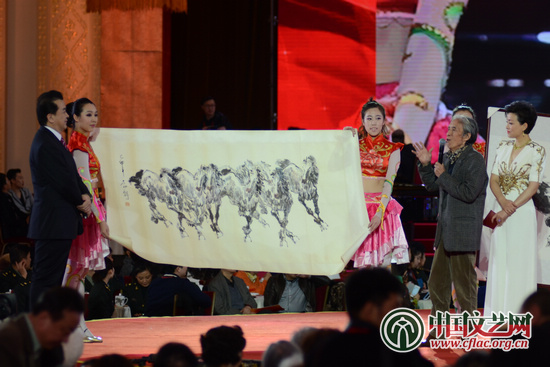 特別環(huán)節(jié)“丹青頌馬” 中國文藝網(wǎng) 高晴 攝 與書法家、藝術(shù)家現(xiàn)場書寫的“賽馬”不同,著名美術(shù)家劉勃舒、劉大為、張道興、杜滋齡、吳悅石、崔如琢則現(xiàn)場“曬馬”,展示了他們提前創(chuàng)作好的以馬為主題的畫作,給全國人民拜年。