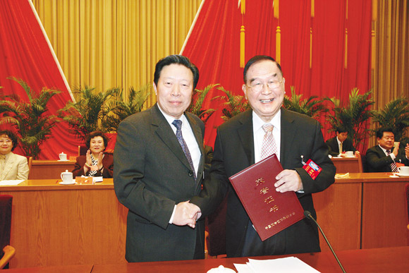 2011年11月25日,全國政協副主席、中國文聯第九屆主席孫家正(左)為中國文聯第九屆名譽主席周巍峙頒發榮譽證書。 孟祥寧 攝