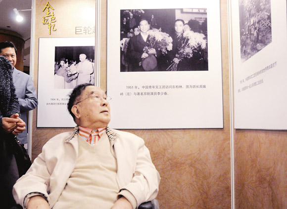 二○一二年十月二十九日,周巍峙在《金色記憶——新中國早期文化交流口述記錄》新書發布座談會現場參觀圖片展。新華社發 畢曉洋 攝