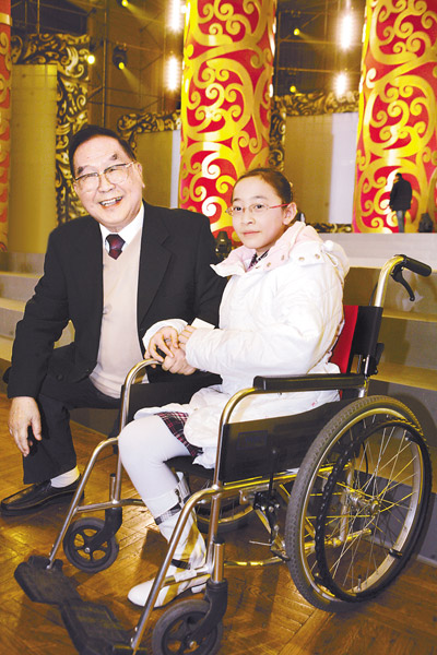 百花迎春——中國文學藝術界二○○九春節大聯歡現場,周巍峙和在汶川地震中致殘,在北京殘奧會開幕式上有精彩表演的芭蕾女孩李月在一起。 孟祥寧 攝