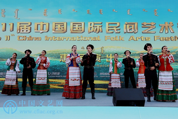 8月25日,參加第11屆中國國際民間藝術節的藝術團在內蒙古呼和浩特多地開展巡演。圖為和林盛樂廣場演出現場。中國文藝網 韓雪竹攝