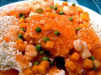 天下第一名菜”又名“蝦仁鍋巴”,亦叫“平地一聲雷”、“春雷驚龍”,是江南蘇錫地區(qū)的傳統(tǒng)名菜。