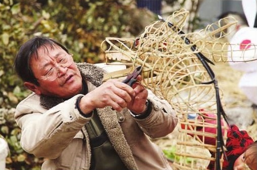 費土根說,草龍的制作光憑他一個人的力量是不夠的,他有幾個好幫手。“他們個個都是正宗的篾匠,削竹子的手藝都比我強。”但費土根之所以為“傳承人”,自然有他的“絕活”——設計。這是其他人所無法替代的,無論是扎草龍,或是兔子燈這些民俗燈彩,費土根都不用畫設計圖,靜靜地想一想,構思便全在腦海中,一點點地扎編便是。因此,在團隊里,他是設計師、指揮者,也是核心。