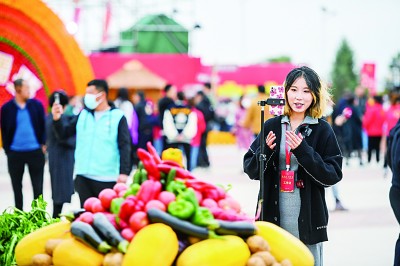 2022年9月19日,一位主播在內蒙古“中國農民豐收節”主會場進行直播。新華社記者 彭源攝