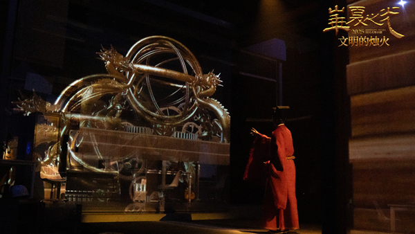 沉浸式舞臺劇《華夏之光·文明的燭火》講述年輕記者齊觀深度參與高海拔宇宙線觀測站“拉索”的建設報道,見證了“拉索”捕獲來自“蟹狀星云”超高能光子信號的歷史性時刻。正是這次“捕獲”,觸發了一場時空穿越之旅。齊觀來到北宋,親歷蘇頌等科學家對“無關客星”的觀測與記錄。面對天象異變,蘇頌堅持科學精神,力排眾議,為觀測浩瀚宇宙,探索未知,推動“水運儀象臺”的研制。