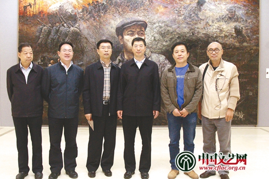 2015年10月15日,石油文聯協辦了由中國文聯舉辦的“時代領跑者”大型展覽,石油文聯主席喻寶才(右三)與巨幅鐵人油畫作者傅劍鋒(右二)在鐵人畫像前合影