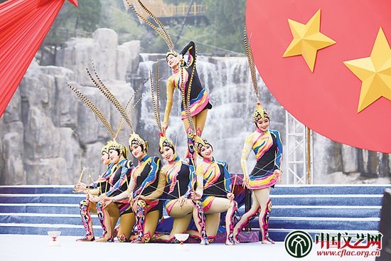 中國文聯文藝志愿服務團“送歡樂下基層”赴狼牙山革命老區慰問演出現場,中國雜技團表演雜技《俏花旦——集體空竹》