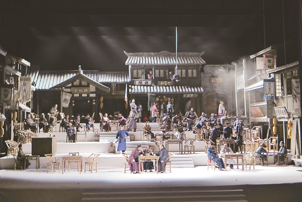隨著第三聲鐘響,燈光漸熄,大幕徐徐開啟。與北京人藝版《茶館》不同的是,四川話版《茶館》以倒敘方式入手,老年的王利發、常四爺、秦二爺拄著拐杖,踏著蹣跚的腳步出場,北京人藝版最經典的一幕“仨老頭撒紙錢”的部分被挪到了戲的序幕,這也令人大吃一驚。而大幕一拉開,便引得臺下觀眾發出了贊嘆,似山城碼頭層層疊疊的階梯式舞臺擺起了龍門陣,熱氣騰騰的市井氣息撲面而來,隨后麻辣燙般味道十足的叫賣聲此起彼伏,手巾板兒滿天飛,春熙路生意興隆的大茶館中上演著悲歡離合,立刻讓人充滿期待。
