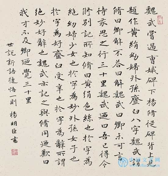 在對時代特點和字體特殊性有如此清晰認識的前提下,楊明臣仍然選擇小楷作為主攻方向,顯示了巨大的勇氣和堅卓的毅力。能夠從千軍萬馬中走出自己的道路,成為當下小楷書法的代表性人物之一,他的付出是可想而知的。他在《小楷的格調(diào)》中寫道:“往往需要積十年、數(shù)十年之功才能稍顯個人面貌。”這句話與其說是在勸告讀者不可“妄取捷徑”,不如說是他的自況。若無超越常人的艱苦磨礪,他作品中那得古法之妙而又融入我意、我法、我情、我趣的高超技術(shù),是斷斷不可能實現(xiàn)的。