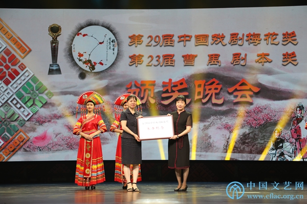 4月26日,第29屆中國(guó)戲劇梅花獎(jiǎng)和第23屆曹禺劇本獎(jiǎng)在廣西南寧頒獎(jiǎng)。圖為中國(guó)戲劇家協(xié)會(huì)分黨組副書記顧立群向廣西壯族自治區(qū)黨委宣傳部副部長(zhǎng)呂潔贈(zèng)送承辦紀(jì)念牌。中國(guó)文藝網(wǎng) 郝紅霞 攝