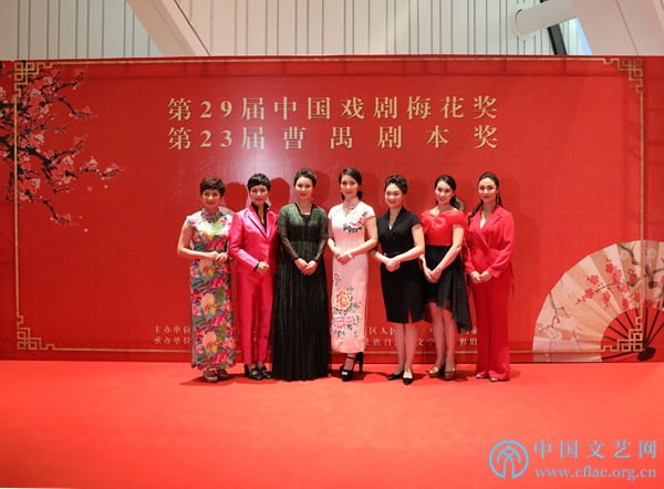 4月26日,第29屆中國(guó)戲劇梅花獎(jiǎng)和第23屆曹禺劇本獎(jiǎng)在廣西南寧頒獎(jiǎng)。圖為榮獲第29屆中國(guó)戲劇梅花獎(jiǎng)的戲曲類獲獎(jiǎng)演員單雯、張歡、陳麗宇、蔡浙飛、李小青、傅希如在紅毯合影。中國(guó)文藝網(wǎng) 郝紅霞 攝