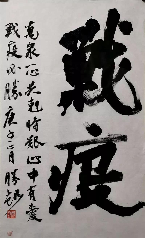 釋文:戰疫——萬眾一心,共克時艱,心中有愛,戰疫必勝。