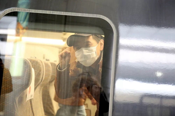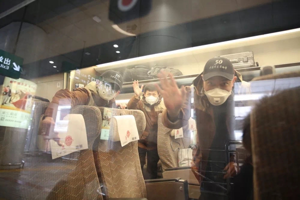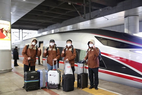 2月20日,中國攝影家協會主席李舸、《中國攝影》報副總編輯柴選、中國文聯攝影藝術中心網絡信息處編輯陳黎明、中國文聯攝影藝術中心主任劉宇(從左至右)踏上開往武漢的高鐵。圖片設計 瞿瀟