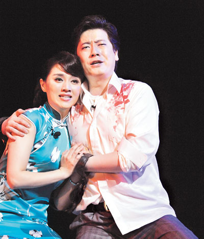 根據(jù)時(shí)代要求,我們還注意了歌劇和音樂劇以及民族、美聲、通俗3種唱法的融合。為了使《野火春風(fēng)斗古城》能達(dá)到最佳的觀賞效果,我們有意識(shí)地在從現(xiàn)實(shí)轉(zhuǎn)入歷史的混聲合唱《國(guó)恥家仇》,高自萍和銀環(huán)的二重唱《吸引力》,高自萍的《今朝有酒今朝醉》《終日黑暗驚慌》《跟我走吧》,陳瑤的《捷報(bào)》《再回來》,銀環(huán)的《心追風(fēng)雨》,中外記者招待會(huì)上眾記者演唱的《今天有新聞》等許多唱段處,從唱詞到音樂以及導(dǎo)演的舞臺(tái)調(diào)度、舞臺(tái)處理上都融進(jìn)了許多音樂劇的元素。我們還大膽地根據(jù)不同角色的身份、性格、年齡,把民族、美聲、通俗3種唱法熔為一爐:金環(huán)、銀環(huán)、楊母是典型的民族唱法;楊曉冬、關(guān)敬陶是“民族美聲”唱法;多田是典型的美聲男中音;當(dāng)代女大學(xué)生和叛徒高自萍則是“民族通俗”唱法,這些角色的不同唱法都統(tǒng)一在整個(gè)劇情和音樂的發(fā)展脈絡(luò)之中,達(dá)到了既豐富多彩又自然貼切的效果。