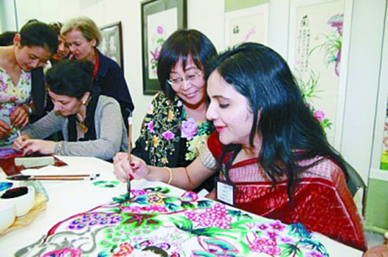 來賓們還欣賞了《中國剪紙藝術薈萃》專題影片,參加了由第三代中國剪紙藝術家——周淑英主持的剪紙工作坊。來自英國、捷克、印度、菲律賓、孟加拉、巴拉圭和世界旅游組織等18個國家和國際組織的女外交官與外交官夫人們圍坐一起,饒有興趣地跟著周淑英老師學起了剪紙,一招一式有模有樣。當一只只“老虎”在她們手下展開時,大家紛紛發出“不可思議”的贊嘆。
