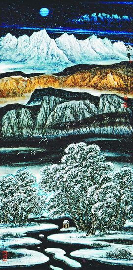 在新疆山水的色彩變現(xiàn)方面,目前較為成功的探索者是毛雪峰,由此,他也被人們譽(yù)為新疆重彩山水畫派的開創(chuàng)者。