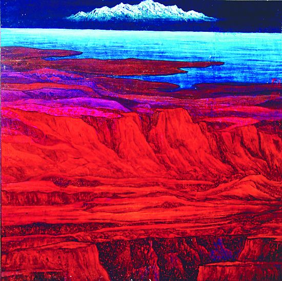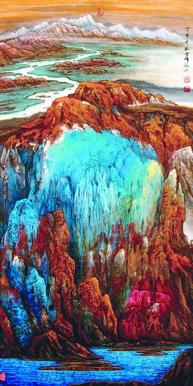 一個畫家成功的重要條件是對生活的積累和其自身所積淀的文化底蘊(yùn),但僅有積累而沒有對生活的獨(dú)特性敏感,沒有找到對這種敏感的獨(dú)特語言表現(xiàn),那也不行。藝術(shù)家既要具備對自然形色的特殊性的敏感,又要具備找到解決問題方案的能力才會有所成,這實(shí)際上是審美判斷,是在文化底蘊(yùn)支配下的藝術(shù)實(shí)踐。一個當(dāng)代畫家要想事業(yè)有成,還必須明確自己的主攻方向,扣住課題,解決課題,有一條合乎邏輯的推進(jìn)軌跡,在藝術(shù)手段的運(yùn)用上要保持一貫性,絕不游離于本當(dāng)解決的藝術(shù)本體之外。一旦審美指向定位了,就不屈不從于時尚的壓力,也不分心去干擾別人,盡可能地不與別人爭論那些本體之外的事情,不在本體以外用功夫,對自己的審美指向要“咬定青山不放松”。我認(rèn)為毛雪峰在藝術(shù)上能形成自己風(fēng)格的原因就在于此,這里我還要強(qiáng)調(diào)指出的是,有些人畫的山水是“畫本所有,活本所無”。相反,毛雪峰的山水畫卻是“活本所有,畫本所無”,這種含蘊(yùn)辯證的一有一無便有了本質(zhì)的區(qū)別。前者無生機(jī),因循于模仿;后者有生命活力,因起于感受和發(fā)現(xiàn),功在原創(chuàng)性和開拓力,這正是毛雪峰新疆重彩山水畫的核心價值所在。畫家對于自然美元素的感受經(jīng)過“遷想妙得”,經(jīng)過轉(zhuǎn)化、積淀、過濾,不斷的提煉升華,最終把自然的生命狀態(tài)凝聚升華為表情表意的狀態(tài),使物我之間完全通達(dá)融會,把自然生命與主體生命合成為藝術(shù)生命,這才是一種最高的境界。中國是一個有著幾千年文化積淀的文明古國,作為國粹之一的中國畫,是一個重要的文化載體,是我們得之于前人的一筆寶貴的精神財富。但是,藝術(shù)的生命在于創(chuàng)新,既要尊重傳統(tǒng)、繼承傳統(tǒng),還要能走出傳統(tǒng),開拓傳統(tǒng)。要以全新的視角把藝術(shù)置于當(dāng)今時代的生活和文化情境中,借助古往今來的一切資源和手段,用獨(dú)特的、富于個性的藝術(shù)語言,在這一片廣闊的自由的天地中施展自己的才華,要站在時代前沿,發(fā)時代之先聲。上世紀(jì)80年代,我曾數(shù)次沿黃河流域上溯尋源,往復(fù)行程3萬公里。所謂大河尋源,實(shí)際上是一次精神之旅,是去探尋“以道藏藝,以藝藏道”的奧秘。我還去探險過千里冰川的長江源頭,登上喜馬拉雅山海拔6000米高處,上過喀喇昆侖、帕米爾高原、巴顏喀拉山和天山,橫跨準(zhǔn)噶爾和塔里木兩大沙漠。如此去上下五千年,縱橫數(shù)萬里,感悟宇宙大生命,從大千世界中間求道,領(lǐng)會那含元報真的元?dú)猓允宫F(xiàn)代山水畫具有一種吞吐古今的氣度和文化底蘊(yùn),并努力以超邁的新形態(tài)與消極遁世的遺風(fēng)訣別,這是我西探邊陲的重大收獲,代價很大,收獲是建構(gòu)起了自己的藝術(shù)場。