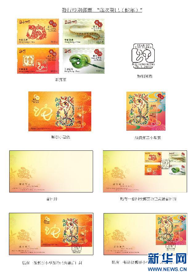 ??? 這是“歲次癸巳(蛇年)”特別郵票、絲綢郵票小型張及首日封等。 1月12日,香港郵政宣布,一套以“歲次癸巳(蛇年)”為題的特別郵票和相關(guān)郵品將于1月26日推出發(fā)售。 (新華社發(fā))