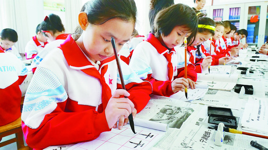 北京掛牌小學規范漢字試點學校,對如何進行漢字書寫出臺專門實施方案;南寧抽樣考核學生卷面書寫;常州實施書法教育“百千萬工程”8年有余,建立64家書法特色學校,培訓500多位教師、6000多名小小書法家;深圳保安黃埔小學實施“五個一工程”:每天認真習字一刻鐘、每周一節書法課、每周一份書法作業、每月一次書法習作展、每個寒假寫一次春聯?!皶ㄊ刮覍χ袊幕a生強烈興趣,上了中學,我還要繼續學習書法。”山東省德州市建設小學六年級學生陳紫晴說。來自深圳的教師鐘傳偉認為,漢字的基礎非常重要,中國人需要有對文化的認同感。