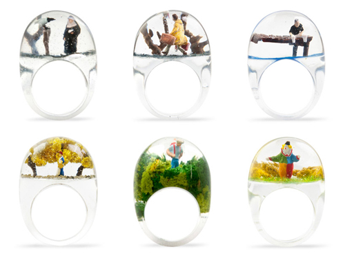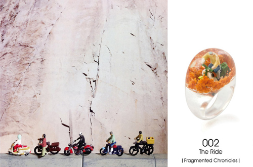來自香港shannnam的設計師duo chan oi yau riyo和kwong ho sun howard在2011年東京設計師周上展出了他們設計的“fragmented chronicles”。這個系列由100枚戒指組成,每個戒指里面都設計了一個人造微型景觀,而且都包含不同的主題,從充滿童趣的元素到雪地里的修女,從帶手提箱行走的女人到牧羊人和羊。每枚戒指都是一個小故事,它能激起人們的想象力和回憶。