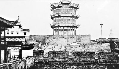 這幅老照片把黃鶴樓置于畫面中心,通過(guò)前景城墻、屋頂以及兩側(cè)房屋飛檐和遠(yuǎn)處白塔等景物,烘托出黃鶴樓的雄偉氣勢(shì)。這幅照片中的黃鶴樓,于1868年“同治年間”重修、毀于1884年“光緒年間”。1985年,黃鶴樓重建,設(shè)計(jì)師以此影像為參考,重塑了今天的黃鶴樓。