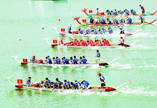 在秭歸峽江兩岸,端午“劃龍船”是人們生活中的一件大事。民間有俗話(huà)說(shuō):“寧輸一季田,不輸一年船。”人們以村落、姓氏、船幫、碼頭、行會(huì)等為單位籌備參賽,沿長(zhǎng)江,西至牛口,東至茅坪,沙鎮(zhèn)溪、歸州、舊州河、窯灣溪、香溪、新灘南北兩岸,都備有一只或數(shù)只龍船。秭歸龍舟競(jìng)渡的地點(diǎn)一直在老歸州鎮(zhèn)的屈原沱,相傳這里是神魚(yú)馱回屈原遺體上岸的地方。自三峽大壩興建、縣城東遷之后,便改在距離大壩一公里處的茅坪徐家沖港灣。