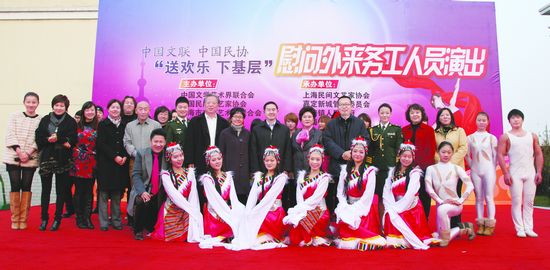 本刊訊 12月4日,由中國文聯、中國民協、上海市文聯聯合主辦,上海民協、上海文聯藝術團承辦的“送歡樂、下基層”慰問外來務工人員演出,在素有明星鄉鎮之稱的嘉定區馬陸鎮外來務工人員集聚區——永盛公寓舉辦。演出以開場鼓樂《盛世龍騰》拉開帷幕,武警上海總隊政治部文工團副團長、青年歌唱家敖長生一曲《上海等你來》表達了上海人民對廣大來滬外來務工人員的真情厚愛;著名評書表演藝術家劉蘭芳,著名薩克斯演奏家詹華康,著名軍旅歌手仝阿梅,上海越劇院著名青年演員斯鈺林、鄧華蔚等數十位藝術家為在場的外來務工人員聯手奉獻了一臺精彩紛呈的演出。