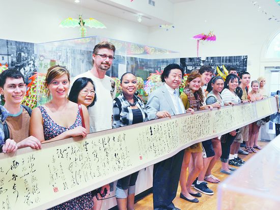 筆者:這次詩意書畫展得到許多外國詩人和藝術家的關注,許多來自不同國家的詩人、藝術家在您創作的詩歌書法長卷上簽名。您對詩意書法的發展前景是怎樣看的?