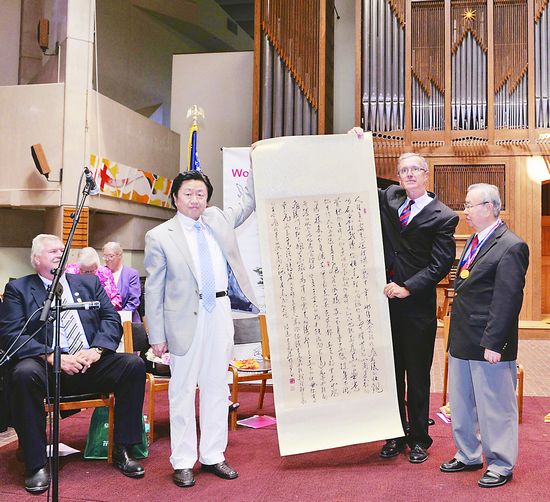 于連勝(左六)在芝加哥美洲華裔博物館應邀為美國朋友題字并合影