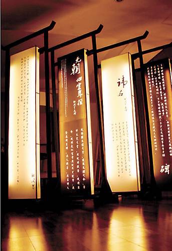 1912年,法國作家維克多·謝閣蘭在北京出版了他的詩集《碑》,詩集木制封面以及書中每首詩的右上角皆配有漢語題詞。在詩集出版百年之際,由北京法國文化中心、中國國家圖書館、中央美術學院主辦的“謝閣蘭《碑》1912-2012”展覽8月29日至10月15日在北京舉辦。該展覽精選了《碑》中12首詩歌作品,并按照謝閣蘭原著風格配以書法題詞。展覽共包含20塊展板,其中有7塊為中式卷軸書法作品。展板形式與尺寸的選擇重現“碑”的形態,而最能表達“碑”神韻的便是傳統樣式的書法。展覽所選詩歌為中法雙語,其中旅法藝術家詩藍的裝置作品《碑》非常引人注目,她帶來81塊“碑”,“81”是北京天壇圜丘上層最外環石板的數量,也是謝閣蘭的《碑》1912年首版的印刷量。