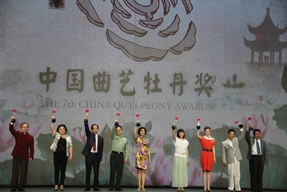 第七屆中國曲藝牡丹獎最終評選出節(jié)目獎5個、表演獎12個、文學(xué)獎7個、新人獎8個、理論獎5個、終身成就獎6個、特別獎4個。中篇揚州彈詞《盛世紅伶》、小品《紅色珍寶》、四川揚琴《情懷》、小品《御史拜壽》、小品《莎莎,我愛你》獲節(jié)目獎;王大海、李連偉、季靜娟、方劍林、楊魯平、顧竹君、任平、李白燕、劉穎、潘家富、薛維萍、賈玲獲表演獎;周玉峰編述、張戩煒整理的長篇常州評話《常州白泰官》,陳小平創(chuàng)作的西河大鼓《退獎牌》,焦隨東、焦蘊創(chuàng)作的大調(diào)曲子《留守娃》,楊子春、史琳創(chuàng)作的對口單弦《血宴》,徐惠新創(chuàng)作的新編短篇蘇州彈詞《梁祝·梳妝》,王立海創(chuàng)作的群口快板《好人的故事》,文華、蘭建堂創(chuàng)作的南陽鼓兒哼《朱主任趕豬》獲文學(xué)獎;新人獎由李響、李想、曹云金、王丹丹、陶鶯蕓、李然、高曉攀、逗樂獲得;于林青的《曲藝音樂寫作探要》,張爽的《寧夏曲藝簡史》,朱棟霖的《經(jīng)典〈雷雨〉:從話劇到蘇州評彈》,孫立生的《曲藝藝術(shù)ABC》,李廣宇、張凌怡的《亂里世界、靜里春秋——河南墜子藝術(shù)流變與傳承》獲理論獎;終身成就獎由馬增蕙、田連元、吳宗錫、單田芳、金聲伯、常寶霆獲得;小品《村官李仁義》、琵琶彈唱《九天九夜》獲節(jié)目特別獎;范林元創(chuàng)作的中篇蘇州彈詞《陳云的故事——凌云出岫》、李國文創(chuàng)作的長篇快板書《神虎將星趙尚志》獲文學(xué)特別獎。