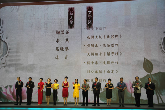 第七屆中國曲藝牡丹獎新人獎和文學(xué)獎獲得者上臺領(lǐng)獎