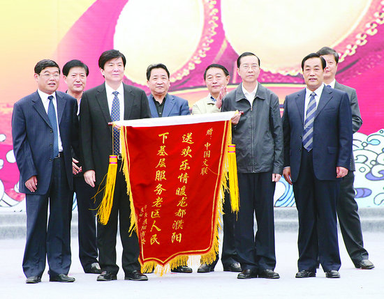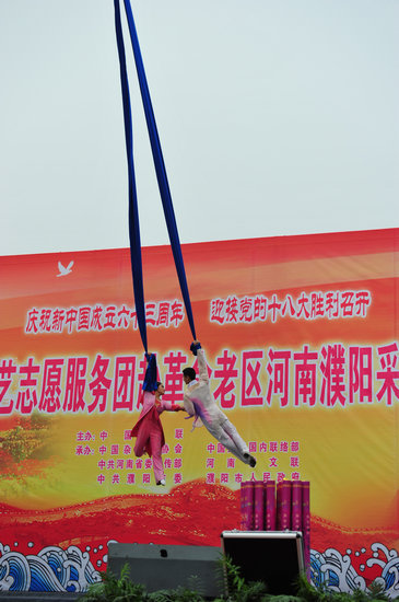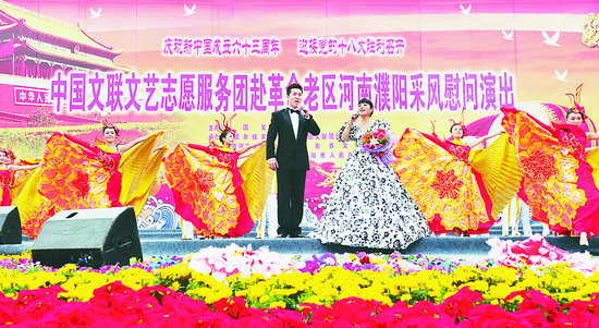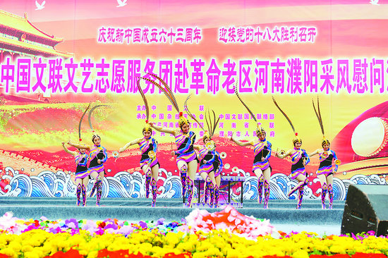 這里,為慶祝新中國成立63周年、喜迎黨的十八大勝利召開,由中國文聯(lián)主辦,中國雜協(xié)、中國文聯(lián)國內(nèi)聯(lián)絡(luò)部、河南省委宣傳部、河南省文聯(lián)、濮陽市委市政府承辦的中國文聯(lián)文藝志愿服務(wù)團赴革命老區(qū)河南濮陽采風慰問演出活動正在進行。藝術(shù)家們的精彩演出和真摯祝福讓當?shù)厝罕娫谥星铩鴳c兩節(jié)前夕感受到了喜慶與溫馨。歌聲在這里飛揚,笑聲在這里彌漫,掌聲在這里飄蕩,而“愛國、為民、崇德、尚藝”的文藝界核心價值觀也在這里彰顯和生動詮釋……