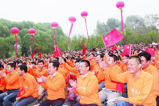 俗話說,一場秋雨一場寒,雨后的濮陽氣溫略顯清冷,但是演出現(xiàn)場的氛圍卻是火熱異常。觀眾們臉上洋溢著的開心的笑容成為了他們的共同標記,這些觀眾來自濮陽的各行各業(yè),有石油工人,有醫(yī)護人員,有公安干警,有老師和學生,有農(nóng)民、外來務(wù)工人員……而坐在觀眾席第一排的身批紅色綬帶的老紅軍、優(yōu)秀黨員、道德模范和勞動模范,猶為搶眼。欣賞著內(nèi)容豐富的節(jié)目,觀眾或被逗得哈哈大笑,或跟著旋律不由自主地隨聲哼唱,或被驚險刺激的雜技動作引得連連驚呼,他們用力地揮舞著手中的旗幟和花束,大聲地叫著好、拍著手,以此表達對于演員和節(jié)目的喜愛,而廣場四周隨風飄揚的火紅條幅上“祝中國文聯(lián)文藝志愿服務(wù)團演出圓滿成功”的字樣則蘊含著濮陽人民對于中國文聯(lián)組織此次活動的感謝之情。臺上演員賣力地演出,臺下觀眾熱烈地鼓掌,那一刻,現(xiàn)場的每個人心中都燃燒著火樣的熱情。
