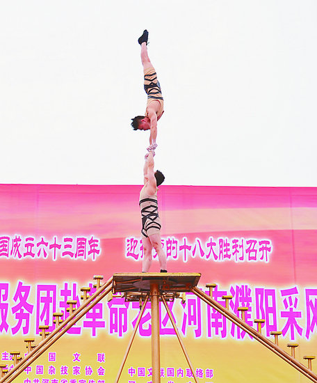 楊剛、牟強是遂寧市雜技團雜技節(jié)目《雙人倒立技巧》的主演,在國內(nèi)外重大雜技賽場多次獲得金獎。他們每天都要在北京朝陽劇場演出2場。9月25日,晚上9點演完最后一場就連夜乘車奔赴濮陽,為了確保安全,團長親自帶隊,于26日凌晨趕到濮陽。稍事休息,就參加了上午的小分隊演出以及下午的主場演出。演出結(jié)束后,他們又連夜趕回北京準備次日的演出。