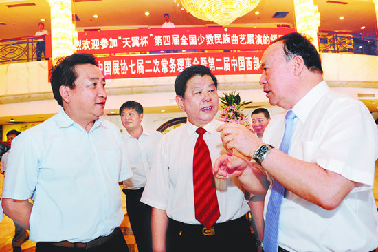 2010年7月15日,在貴州省舉辦的第四屆全國少數(shù)民族展演活動(dòng)閉幕式前,白立忱與胡振民、姜昆親切交談