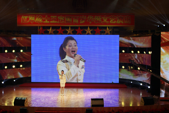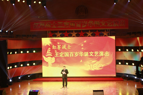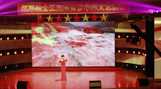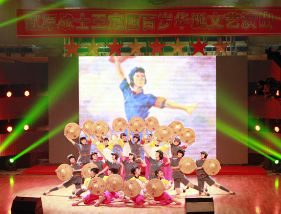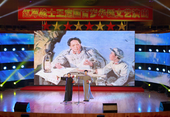 為了貫徹落實黨的十八大報告精神,弘揚愛國主義傳統,由八路軍老戰士文工團主辦的紅軍戰士王定國百歲華誕文藝演出于12月12日下午在中國音樂學院音樂廳舉行。 原中共中央委員、中央宣傳部部長王忍之,原全國人大常委、中央文獻研究室原主任逄先知,原全國人大常委會副秘書長、《求是》雜志總編輯有林,原全國政協科教文衛副主任王巨才,全國政協委員、原中國文聯副主席胡珍等領導和部分抗日老戰士出席觀看了演出。