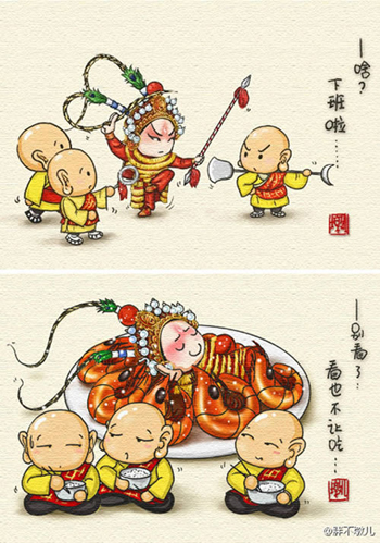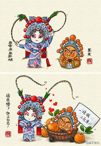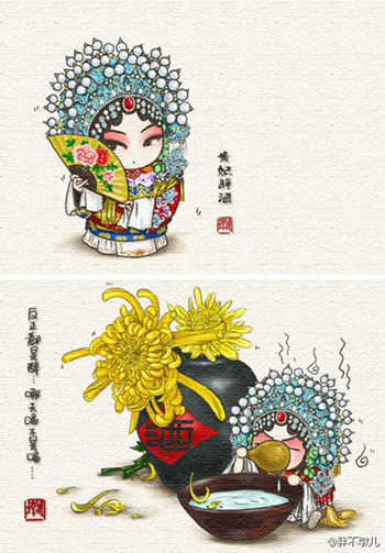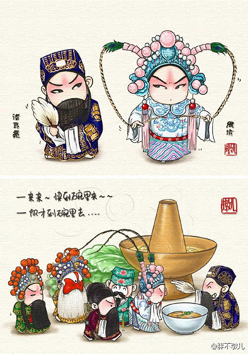 作為京劇愛好者,胖不墩兒自稱票友,一直愛聽?wèi)颍蚕M麑?duì)普及京劇藝術(shù)盡一點(diǎn)力量。她從去年就開始畫系列漫畫《說段京劇你聽嗎》,用的是輕松的漫畫方式來戲說京劇的劇情。隨后畫下了“舌尖上的京劇”,始終以京劇造型和故事為基礎(chǔ)藍(lán)本。