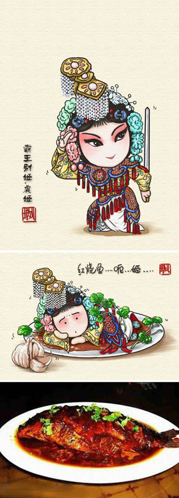 半年前,胖不墩兒畫了一幅《穆珂寨》孟良和焦贊被火燒的卡通漫畫,有網(wǎng)友調(diào)侃地評(píng)論這兩個(gè)人物形象有點(diǎn)“烤串兒”的味道。于是,“胖不墩兒”將京劇和美食結(jié)合起來,“舌尖上的京劇”由此誕生。