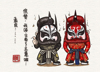 “我打小看京劇,這組漫畫里,都是根據(jù)人物扮相的顏色和造型來定相似的食物”,胖不墩兒說起戲來也頭頭是道,其中,有一幅漫畫是諸葛亮招呼周瑜等東吳將士進(jìn)火鍋,這出戲講的是《群英會(huì)》,暗指火鍋中的各色食物群英薈萃。“孫劉合作,諸葛亮作為外援到東吳,但是周瑜妒忌諸葛亮,二人斗智斗勇。個(gè)人感情上我比較偏向諸葛亮,所以當(dāng)食物時(shí),諸葛亮就占一回主導(dǎo)地位,讓周瑜先進(jìn)碗。”