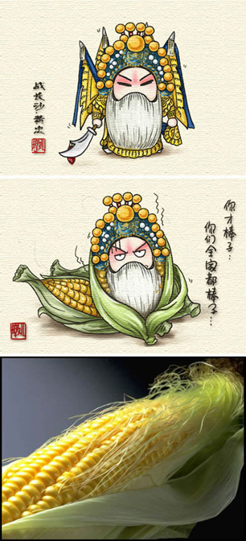 “舌尖上的京劇”漫畫系列一共由18幅作品組成,每幅作品都有一個(gè)主題故事。黑臉包公是芝麻元宵;醉酒的貴妃頂著菊花大飲菊花酒;白娘子、許仙和小青分別變身白小方、許紫薯、青小團(tuán),對(duì)應(yīng)的美食則是奶油蛋糕、紫薯團(tuán)以及青團(tuán)子;因?yàn)榭^的絨球像山楂,穆桂英躲在了山楂籃子里,而長(zhǎng)須老將黃忠則變身玉米棒子……加上配文很多都是搞笑段子,萌版的人物造型加上食物,讓網(wǎng)友們個(gè)個(gè)大呼“可愛”