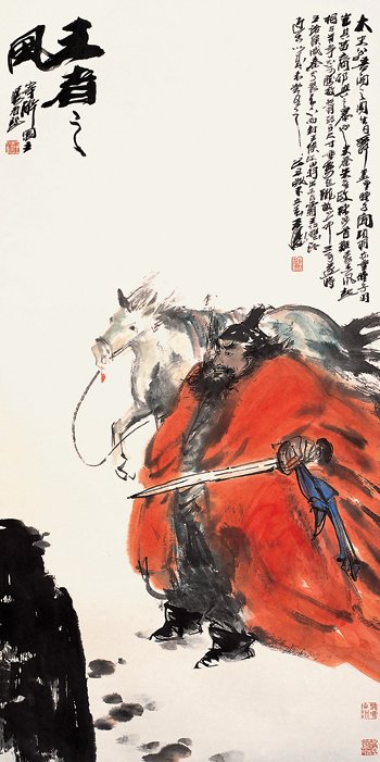 進入新世紀以來,王濤開始了新的探索。《竹林七賢》《莊周夢蝶》等歷史人物畫,體現了他對中國畫傳統美學回歸的一種思考。在這類作品中,勾線、沒骨、皴擦、潑墨等技法駕輕就熟,似信手拈來,筆墨的形式美和造型的抽象美結合,筆墨酣暢淋漓,意到筆到,筆到神到。他早期作品中注重的塊面、結構蕩然無存,繪畫至此才變成了王濤抒發胸中逸氣和文人情懷的載體。在《莊周夢蝶》中,微醺的莊周醉臥在一塊大石頭上,雙肩微聳,抄袖而臥,臉色潮紅,雙眼緊閉。王濤用率性的筆墨描繪出人物動感十足的美髯雙眉,飛舞中抑揚頓挫的線條勾畫出紅色的頭巾和懸掛的腰帶,整個畫面從狂草筆法的人物,到背景飛流直下的瀑布和臥石邊的流水,無處不散發出濃濃的醉意。