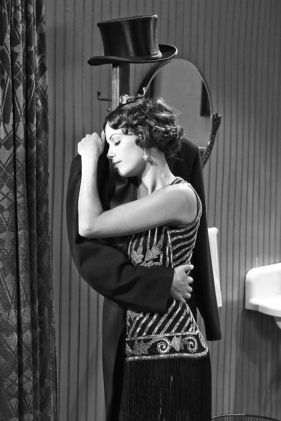 看似簡潔敘事的背后,是創(chuàng)作者對(duì)時(shí)代特征以及人物形象的著力描摹,這使得影片雖然情節(jié)平淡,觀眾看來卻絲毫不覺乏味冗長。劇中喬治與佩佩在樓梯碰面的片段是在洛杉磯的布拉德伯里大樓取的景。這座始建于1893年的建筑將觀眾帶回那個(gè)遙遠(yuǎn)的年代,上下錯(cuò)落的結(jié)構(gòu)更是與劇中人一個(gè)漸入事業(yè)谷底、另一個(gè)即將大展宏圖的狀態(tài)相契合。從喬治夫婦的餐桌對(duì)話到一段名為《佐羅的標(biāo)記》的戲中戲,都不難發(fā)現(xiàn)導(dǎo)演向《公民凱恩》《一個(gè)明星的誕生》等電影史上佳作致敬的影子。片中飾演喬治的讓·杜雅爾丹那一撮標(biāo)志性的小胡子,以及他優(yōu)雅不失幽默、真摯不失靈氣的表演,更是讓人們仿佛看到了卓別林、金·凱利那些默片巨星的風(fēng)采。雖然有對(duì)經(jīng)典的模仿,導(dǎo)演卻摒棄了大部分默片的生硬與刻板,巧妙地取其精髓。片中喬治自導(dǎo)自演的《愛情的眼淚》里,他深陷泥沼、無聲吶喊的場景巧妙地暗示著角色的身份與命運(yùn);佩佩在化妝間,忘情地將手穿進(jìn)喬治的西裝衣袖,并假扮成兩人深情相擁的畫面,更符合了“此時(shí)無聲勝有聲”的意境。