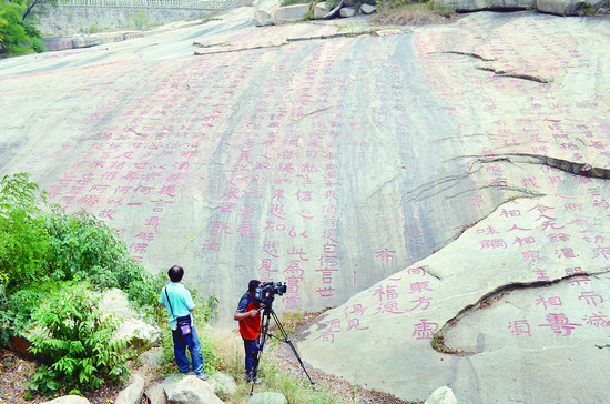 在央視中文國際頻道2013年的開年大片《中國書法五千年》的拍攝過程中,5個攝制組走過近10萬公里、橫跨歐美亞三大洲,拍攝考古遺跡和博物館數(shù)百處、有關書法的文物3萬余件,力圖呈現(xiàn)書法的核心價值。圖為攝制組拍攝摩崖石刻。
