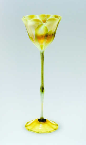 蒂凡尼的許多畫品都在表面裝飾運(yùn)用了植物主題,這件作品的不同之處在于它通過對器皿本身的造型演繹了自然事物的形態(tài)。蒂凡尼的天才玻璃工匠將一只傳統(tǒng)的玻璃杯改造成這樣一只花瓶,仿佛怒放的鮮花。
